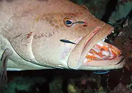 Elacatinus puncticulatus are found in corals in the continental shelf of the TEP. They often live in association with sea urchins, although the reason for this is undetermined.[6] The Elacatinus genus feeds primarily on ectoparasites from cleaning and cellular fish debris, and E. puncticulatus seem to be no different.[5] Both males and females clean. Cleaning gobies can display cheating behavior when cleaning with a partner, where they consume scales and mucus from the clients instead of just ectoparasites, although this is uncommon in the Elacatinus genus. When cleaning with the opposite sex, males tend to modify behavior to be more cooperative and females tend to stay the same.[7] Clients of this cleaning mutualism are either non-predatory fish like parrotfishes,[8] or piscivorous fish that are potential predators for the goby, like longfin damselfish,[9] yellowtail damselfish,[10] and graysby grouper.[11] While some clients are predatory to E. puncticulatus and other cleaner gobies, the predatory clients are often immediately cleaned upon arrival, which could help their identification as a cleaner and reduce the risk of predation.[9] The immediate cleaning of those predator clients may reduce the risk of predation, but it does not provide any foraging advantage since predator clients and non-predator clients offer the same amount of ectoparasites, and predatory clients often decrease the visits made by the more abundant non-predatory clients.[9][8]
