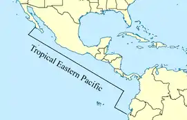 E. puncticulatus are a shallow-living goby found along the continental shore of the Tropical Eastern Pacific (TEP), which ranges from the Southern tip of the California peninsula to the South of Ecuador. Specifically within this area, the species live primarily between the subtidal zone and depths of 21m on rocky or coral reefs.[4][5][6] Their habitat on coral reefs, considered “cleaning stations”, which combined with the bright blue coloration on parts of their head allows the species to attract clients and feed off of the removed ectoparasites.[2] They are the only species of the genus Elacatinus not found in the Atlantic, and only one of two species in the genus found in the TEP. Their distribution is shaped by habitat discontinuities that restrict their dispersal in the area, one of the most notable examples being two muddy sections of shore within the TEP.[6]