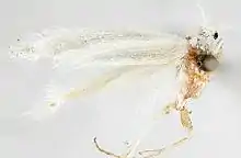 The wingspan is 9.5–10.5 millimetres (0.37–0.41 in). The forewings are white, with a few pale ocherous scales forming a faint spot at the middle of the fold. A second spot is located at the end of the fold, and a smaller spot at the end of the cell. The apex of the wing is tinged with ocherous. The hindwings are shining white.[3]