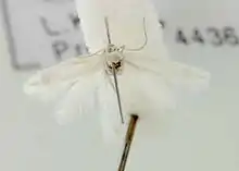 The wingspan is 7.5–9 mm. The forewings and hindwings vary from white to yellow, irrorated (sprinkled) with brownish-tipped scales.[2]