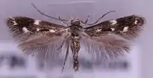 The wingspan is 8–10 millimetres (0.31–0.39 in). The head is grey, face white.Forewings are blackish ; a spot on fold towards base, one on middle of costa and another beneath it on fold, in female larger and sometimes confluent, a fourth on tornus, and a fifth at apex shining white. Hindwings are dark fuscous. The larva is greenish-grey, faintly reddish tinged.[2]
