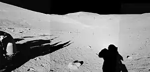 Station 1 is located on the east flank of Elbow Crater, a 400-m-diameter crater that lies near the junction of the mare surface and the Apennine Front. Elbow Crater is a relatively old Copernican-age crater formed by an impact at a sharp bend in Hadley Rille. Elbow is approximately 0.5 km north of the foot of the Hadley Delta slope. Younger small craters occur on the Elbow Crater ejecta blanket. The surface is generally flat but hummocky in detail. The surface material is composed of fine-grained soil with sparse to common pebble-size and larger fragments. The larger fragments are locally concentrated around the young, fresh crater on the Elbow Crater ejecta blanket.