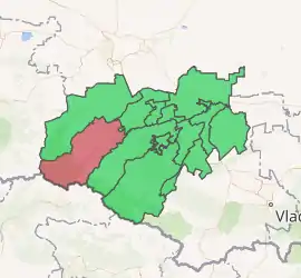 Within the framework of administrative divisions, Elbrussky District is one of the ten in the Kabardino-Balkar Republic and has administrative jurisdiction over one town (Tyrnyauz) and ten rural localities.[1] As a municipal division, the district is incorporated as Elbrussky Municipal District.[4] The town of Tyrnyauz is incorporated as an urban settlement and the ten rural localities are incorporated into six rural settlements within the municipal district.[4] The town of Tyrnyauz serves as the administrative center of both the administrative[1] and municipal[4] district.