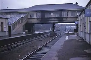 Elderslie station closed on 14 February 1966 and was demolished shortly after,[1] however it remained a junction until the closure of the Paisley Canal Line through to Kilmacolm in 1983. Following the Ayrshire Coast Line electrification in 1986, an Up Passenger Loop remains, and the line to the south west is signalled for bi-directional working. All that remains of the station now is the bricked off entrance on the main road, which once led to the covered walkway, and a large brick abutment adjacent to the current Glasgow to Ayr line.[3]