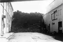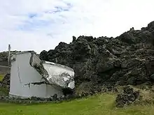 Houses close to the rift were soon destroyed by lava flows and tephra fall.[6] A few days after the eruption began, the prevailing wind direction moved to the west, resulting in extensive tephra falls over the rest of the island, causing extensive property damage. Many houses were destroyed by the weight of the ash fall, but crews of volunteers working to clear the ash from roofs and board up windows saved many more. By the end of January, tephra covered most of the island, reaching 5 metres (16 ft) deep in places. Apart from falling ash, some houses were also burned down by fires caused by lava bombs, or overridden by advancing lava flows.
