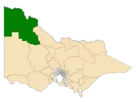 Mildura is an electoral district of the Legislative Assembly in the Australian state of Victoria and sits within the Northern Victoria electorate.[1] It is a 35,702 km2 rural electorate in the far-north-west of the state, encompassing the regional towns of Hopetoun, Mildura, Ouyen, Red Cliffs and Robinvale. It is currently represented by independent Ali Cupper.
