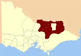 It was based in north-eastern Victoria, south of the Murray River.[2] Its area was defined in the Victorian Constitution Act of 1855 as: "Bounded on the South and West by the Counties of Evelyn and Anglesea and the River Goulburn to its Junction with the River Murray; on the North and North-east by the River Murray; and on the East by the great dividing Range, excepting the Country comprised in the Electoral Districts of the Murray Boroughs and of Beechworth" (Ovens).[3]