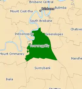 The electorate of Yeronga was formed in 1950, with the Liberal Party's Winston Noble holding the seat for fourteen years. Norman Lee, also of the Liberal party, then held the seat until 1989. Matt Foley of the Labor party then won the seat. In 2001, the seat was renamed to Yeerongpilly. At the 2004 state election, Foley chose not to run for the seat again, with Simon Finn taking his place in the seat.[2] In the 2006 redistribution, the suburbs of Archerfield, Coopers Plains and Tennyson were lost, yet the suburbs of Fairfield, Tarragindi and Wellers Hill were gained.[2] In 2017, Yeerongpilly was abolished and replaced by the electoral district of Miller.