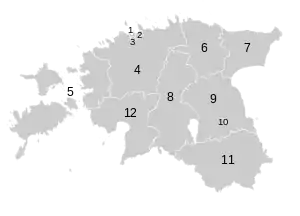 The Estonian Riigikogu, or Parliament, is made up of 101 members, elected from 12 separate geographic areas, or electoral districts. The constituency division is based on the counties of Estonia, of which some are combined or divided depending on the size of the population. The capital city Tallinn is divided into three electoral districts based on administrative districts within the city.[1] In the elections to the European Parliament, Estonia has only one national electoral district.[2]