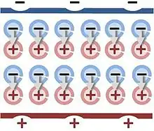 Above, discussion was deferred for the first term in the expression for the potential due to the dipoles. Integrating the divergence results in a surface charge. The figure at the right provides an intuitive idea of why a surface charge arises. The figure shows a uniform array of identical dipoles between two surfaces. Internally, the heads and tails of dipoles are adjacent and cancel. At the bounding surfaces, however, no cancellation occurs. Instead, on one surface the dipole heads create a positive surface charge, while at the opposite surface the dipole tails create a negative surface charge. These two opposite surface charges create a net electric field in a direction opposite to the direction of the dipoles.