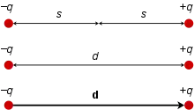 and is directed from the negative charge to the positive one. Some authors may split d in half and use s = d/2 since this quantity is the distance between either charge and the center of the dipole, leading to a factor of two in the definition. A stronger mathematical definition is to use vector algebra, since a quantity with magnitude and direction, like the dipole moment of two point charges, can be expressed in vector form