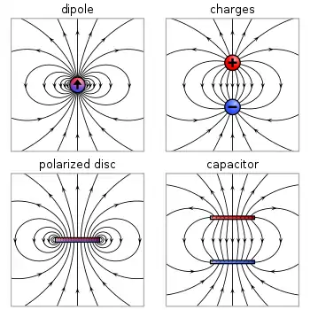 The electric field due to a point dipole (upper left), a physical dipole of electric charges (upper right), a thin polarized sheet (lower left) or a plate capacitor (lower right). All generate the same field profile when the arrangement is infinitesimally small.