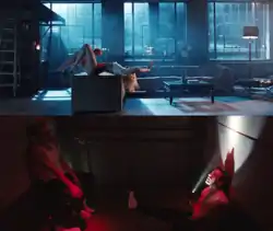 As Lipa dances, she kicks her legs up on a couch, eventually turning on the electricity with her dance moves, and drawing people in with her flickering lights and energy, beginning with two men. Ronson and Diplo are seen getting on an elevator and pushing the button, before the elevator shakes, and they get stuck. Lipa's party escalates to where a crowd of people, who shine their flashlights, join her in her now luminous loft. The video then fast-forwards to the next morning, where several people lie on the floor, with a woman playing the keyboards, and a man playing the drums. Lipa sits on a chair and opens her eyes.[11][88][89] The visual closes with another clip of Ronson and Diplo in the dark broken elevator, with Ronson using a flashlight.[83]