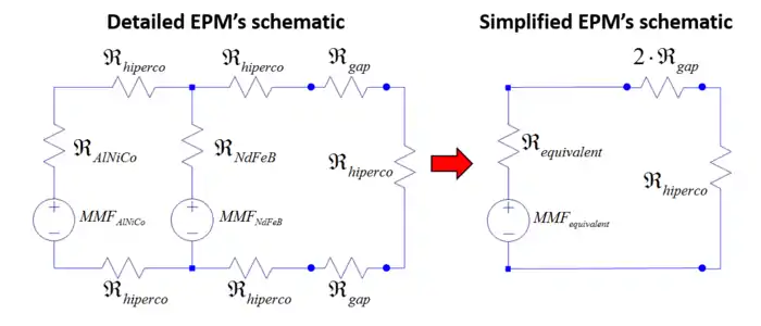 But the magnetic circuit can be simplified by using electric source transformations and considering all the hiperco in only one big reluctance (mainly because the value of those small pieces of reluctance are negligible compared with the reluctance of the permanent magnets). A simplified version of the magnetic circuit was presented on the right in the picture above: