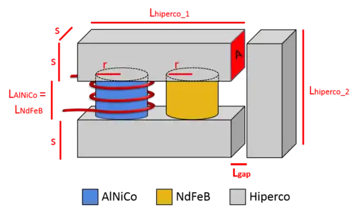 For the calculation of the values of the components in the circuit we will assume that all the areas in the flow have the same dimensions. If the selected magnets had a cylindrical shape then the area of the flow for the magnets will be and the hiperco blocks will have a square section of side in order to have the same area.