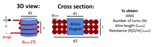 The first and most important step is to design the solenoid that will create the magnetic field to reverse the magnetization of the AlNiCo. As mentioned before the AlNiCo has an intrinsic coercivity of 50kA/m so it is necessary to create a field of at least: . It is recommended to design the field 3 times higher than the intrinsic coercivity to fully magnetize a material. Picture below depicts the coil design parameters:
