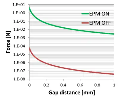 Using the formula for force mentioned earlier it is possible to plot the force as a function of the gap distance of the external hiperco bar. Two curves were obtained: one for the EPM in ON state and the other for the EPM in OFF state: If we plot those forces together it is possible to observe the difference of at least 4 orders of magnitude from the EPM when is ON and OFF (This plot is an example of EPM with two cylindrical magnets -one NdFeB and the other AlNiCo- of 1mm diameter and length. The soft magnet material is hiperco with square section bars of side 0.889mm to make the flux area equal to the one in the magnets):