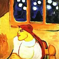 Guro is well-known for her fascination with the contrast between the urban world and nature, once writing in a short story about the psychology of people based in cities.[8][6] Her fascination appears to have begun with the way a city looks, for example its street lights and gilded windows. It is said that Guro was the most "urbanist" of the early twentieth-century Russian poets for the "concreteness" of her representations of the Russian cityscape.[9] Eventually, she became tired of the subject in about 1910, when the very theme was growing popular with her Cubo-Futurist colleagues. According to Matyushin, she would now stay in the countryside from Spring until Autumn.[8]