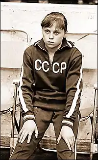 Elena Mukhina was born June 1, 1960, in Moscow, Russian SFSR. Both her parents died when she was five years old.[1] She was raised by her grandmother, Anna Ivanovna.