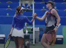Rybakina is a former world No. 3 junior.[9] She began playing on the ITF Junior Circuit in November 2013 at the age of 14. The following March, she won her first title at her second career event, the Grade-3 Almetievsk Cup. She played her first Grade-2 event in June at the Ozerov Cup in Moscow, finishing runner-up to compatriot Anna Blinkova. She began playing Grade-1 events from the start of 2015, but did not have any success until she reached the final at the Belgian International Junior Championships in May, losing to Katharina Hobgarski. Rybakina made her junior-Grand Slam debut later in the year at the US Open, where she reached the third round. Following an opening-round loss at the 2016 Australian Open, she won back-to-back Grade-1 titles. She continued to struggle at the junior Grand Slam and other Grade-A events in singles for the rest of the year.[10] Her best result of 2016 at the Grade A-events came in doubles when she finished runner-up to Olesya Pervushina and Anastasia Potapova at the Trofeo Bonfiglio, alongside Amina Anshba in an all-Russian final.[11]