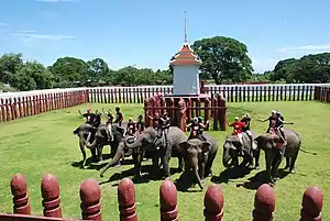 For hundreds of years the Kings of Thailand would attend the Royal Elephant Round Up and choose the best and strongest elephants that would work and live alongside the Thai people, and be used for labor or the military. The last annual roundup from the wild was in 1906, a spectacular display and testament to the King's power and skills of the mahouts. Note: The term "kraal" means "an enclosure into which are driven wild elephants which are to be tamed and educated," according to the 1913 Websters dictionary.