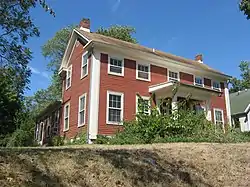 Major structural elements of the house include a pitched roof made of composites and wooden eaves, a large basement with limestone walls and a fruit cellar, and multiple brick chimneys. During its history, the house has received two additions on its western (rear) side: a saltbox-style on the southwestern corner, and a simpler style on the northwestern corner. Individuals may enter the house through a central main entrance; flanked by two windows on each side, the door is surrounded by transoms that may include some original glass.[4]: 2