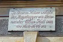 Elias Holl was born in Augsburg, Werbhausgasse 2. He was descended from a master-builder-Family. His father Hans Holl (1512-1594) taught him. In 1596 he passed the exam, the Meisterprüfung. After an abidance in Tyrol and Italy in the years 1600/1601 – he visited Bozen and Venice – in 1602 he became Werkmeister of Augsburg. In 1629 he lost his office as Stadtbaumeister because he was a protestant. Since then he was only called Stadtgeometer. He was dismissed from office in 1631. He is buried in the Augsburg Protestant Cemetery.[1]