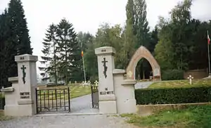 This military cemetery contains the graves of 4,057 French soldiers, the largest concentration of French graves on Belgian soil. In the centre of the cemetery is an arch in the gothic style and inside the arch is a bronze relief by Élie Le Goff depicting the profile of Ernest Cotelle whose sons Georges and Henri gave their lives in the 1914-1918 war and are buried here at Belle-Motte. From 1919 to 1934, Professor Cotelle had given lectures at Belle-Motte.[24]
