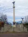 The monument consists of a 93-foot-tall main shaft topped by a 17-foot-tall winged statue of victory. Located on a bluff, the complete work stands more than 300 feet above the Mississippi river below. It has two side spires mounted by eagles, as well as two bronze lion chalice statues. A stone whispering wall bench wraps around the central spire. Visitors can hear someone whispering who is completely out of sight on the opposite side.