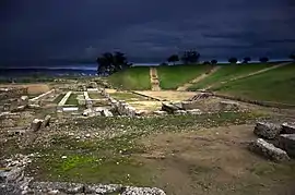 Elis (Ancient Greek: Ἦλις, Doric Greek: Ἆλις, in the local dialect: Ϝᾶλις,[1] Modern Greek: Ήλιδα, romanized: Elida) was the capital city of the ancient polis (city-state) of Elis, in ancient Greece. It was situated in the northwest of the Peloponnese, to the west of Arcadia. Just before the Peneius emerges from the hills into the plain, the valley of the river is contracted on the south by a projecting hill of a peaked form, and nearly 500 feet (150 m) in height. This hill was the acropolis of Elis, and commanded as well the narrow valley of the Peneius as the open plain beyond. The ancient city lay at the foot of the hill, and extended across the river, as Strabo says that the Peneius flowed through the city;[2] but since no remains are now found on the right or northern bank, it is probable that all the public buildings were on the left bank of the river, more especially as Pausanias does not make any allusion to the river in his description of the city.