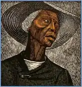 When she moved to Mexico, Catlett's first work as an artist was with the Taller de Gráfica Popular (TGP), a famous workshop in Mexico City dedicated to graphic arts promoting leftist political causes, social issues, and education. At the TGP, she and other artists created a series of linoleum cuts featuring prominent black figures, as well as posters, leaflets, illustrations for textbooks, and materials to promote literacy in Mexico.[24] Sharecropper, one of the linoleum cuts made at the TGP, is possibly her most famous work and is an excellent example of Catlett's bold visual style due to both the crisp black lines and rich brown and green inks of the drawing, and the halo of the hat brim and the upward looking angle of the composition making the figure monumental, or someone to be venerated, despite the poverty evidenced by the safety pin holding together the cloak.[25] Catlett's immersion into the TGP was crucial for her appreciation and comprehension of the signification of “mestizaje”, a blending of Indigenous, Spanish and African antecedents in Mexico, which was a parallel reality to the African American experiences.[26] She remained with the workshop for twenty years, leaving in 1966.[27] Her posters of Harriet Tubman, Angela Davis, Malcolm X and other figures were widely distributed.[1]