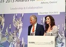 In 2012 Global Thinkers Forum launched the 'Global Thinkers Forum Awards for Excellence', recognising the work of values-driven pioneers. Among the recipients have been Zaha Hadid, Sir David Frost, Arianna Huffington, Tobias Ellwood, Elif Shafak, Sheikha Lubna Al Qasimi, Professor Tu Weiming, Professionals for Humanity, Marianna V. Vardinoyannis, International Red Cross. The Global Thinkers Forum Advisory Board has been supported by thought leaders such as John Alderdice, Princess Sumaya bint El Hassan, Ellen Johnson-Sirleaf, Muna AbuSulayman, Prince Pavlos of Greece, Elif Shafak, Femi Oke. Filippouli is an advocate of values-driven thinking and collaboration, being vocal about 'The imminent need for our societies to build on a long-term vision and to prioritise 'we' instead of 'I'".[5] She has publicly expressed her criticism about Angela Merkel's leadership as "creating cracks in the European Union community, with Germany's superpower role generating inequality and polarization within the EU"[6]