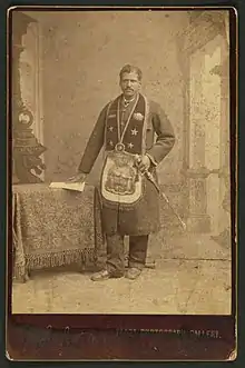 Lizzie Bowser lived in Philadelphia's Twelfth Ward with her husband David Bustill Bowser, with whom she ran a successful business. The couple manufactured memorabilia, regalia, and decorative objects for the many voluntary associations in the area. Their clients included African-American fraternal organizations like the Grand United Order of Odd Fellows, volunteer fire brigades, and American Civil War relief organizations.[1] Lizzie used her skills as a seamstress to craft elaborate ceremonial collars, and David created decorative paintings on hats, banners, and other objects bearing insignia.[2] On one collar in the collection of the National Museum of American History, the maker's mark reads "Mrs. D.B. Bowser Odd Fellows and Masonic Depot.[1]