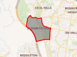 Elizabeth Hills is a suburb of western Sydney, in the state of New South Wales, Australia. It is located 39 kilometres south-west of the Sydney central business district, in the local government area of Liverpool. Elizabeth Hills was gazetted as a suburb on 18 December 2009. Like the neighbouring suburb of Len Waters Estate, Elizabeth Hills had previously been part of the suburb of Cecil Hills.