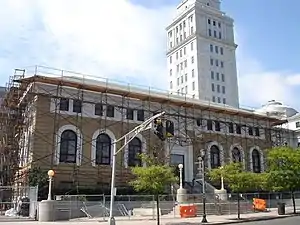 Elizabeth's Main Library was built during the "free library movement" at the turn of the 20th century in part with the impetus of Charles N. Fowler,[4] US Congressman from Union County. It is one of New Jersey's original thirty-six Carnegie libraries, which by the 1940s had become one of the busiest libraries of its size in the USA.[5] Records show that millionaire Andrew Carnegie granted $130,810 made February 3, 1910, for the main and no longer existing Liberty Plaza branch libraries.[6][7] Opened in 1912, the building, reminiscent of an Italian palazzo and the Boston Public Library was designed by Edward Lippincott Tilton,[8] who had designed many other Carnegie libraries as well as the immigration station at Ellis Island. It is a contributing property to the Midtown Historic District, a state and federal historic district established in 1994–1995.[3] The Main Library is the Federal Depository Library for Union County.