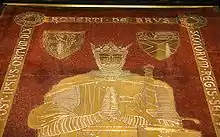 When King Robert died 18 months later, his body was laid to rest next to Elizabeth, who had been interred in the very centre of the abbey beneath the high altar, in an alabaster tomb decorated with gold leaf.[16] Fragments of the tomb still remain and can be seen in the National Museum of Scotland.[17] The abbey was sacked in 1560 by Calvinists during the Scottish Reformation and the tomb was lost. However, King Robert's coffin was rediscovered in 1819 during construction work on the new abbey and Elizabeth's coffin was rediscovered in 1917. Both were re-interred in the new abbey.