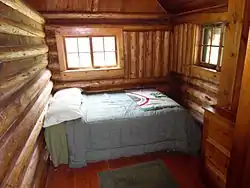 The interior of the cabin is partitioned into three rooms. The interior petitions are made of peeled stacked logs with mortar chinking between logs. The front room (office) is at north end of building. The bedroom takes up the southwest quarter and the kitchen is in the southeast quarter. A steel cable connects the two long walls to keep the winter snow load from forcing the sides of the cabin apart. The floor is covered with 4-inch (10 cm) tongue-and-groove fir planks. The cabin has three doors: a front door facing west, a back door facing east, and a kitchen door facing south. The office has two casement windows. The bedroom and kitchen each have two horizontal sliding sash windows. The kitchen has built-in knotty pine cupboards and the bedroom has a built-in knotty pine dresser. The bedroom also has a built-in closet with knotty pine doors. The ceiling is covered with 4-inch (10 cm)-wide tongue-and-groove fir boards.[1][8]