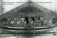 The wind, tide and sea made it impossible for the Liverpool lifeboat to link up with the waiting tug for another tow, so the men were forced to start rowing home. About twenty minutes later, as the boat reached the safer waters of the channel, the master elected to raise the foresail to help steady the vessel.[23] People in the lifeboat were still congratulating themselves on their lucky escape, when Captain Martin noticed a huge wave "like a high wall" approaching.[23] He instructed everyone to hold on, fearing that someone might be washed overboard. However rather than breaking over the boat, the wave lifted it and flipped it over.[23][24][16] The boat was not self-righting, so the remaining survivors were left clinging desperately to the upturned boat. Rattler's master witnessed the incident, signaled to the New Brighton lifeboat, Willie and Arthur, which promptly turned around to come to the rescue.[25][23] The men who were on the capsized boat directed the New Brighton lifeboat to first assist three others who were in more danger clinging to bits of wood in the sea.[23] After picking up the survivors and one casualty, the New Brighton lifeboat was taken in tow by Rattler, which brought her back to New Brighton. Six of Ellen Southard's crew, the captain and his wife, as well as the pilot and three lifeboat men from Mersey Docks drowned or died of exposure (12 fatalities in total).[24]