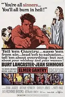 Elmer Gantry is a 1960 American drama film about a confidence man and a female evangelist selling religion to small-town America. Adapted by director Richard Brooks, the film is based on the 1927 novel of the same name by Sinclair Lewis, and stars Burt Lancaster, Jean Simmons, Arthur Kennedy, Shirley Jones and Patti Page.