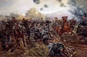 ![]() 9th (Queen's Royal) Lancers charging German guns during the action of Elouges | |||||||