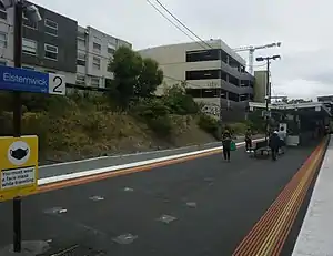 An electric tramline between Elsternwick and Point Ormond opened in 1915, and closed on 22 October 1960, after which the tram route became part of an extended 246 bus route. In February 1959, a project commenced to eliminate the Glen Huntly Road level crossing, where a tramway also crossed the rail line. A temporary two-track station was provided in a side street parallel with the station, which allowed rail services to continue uninterrupted. The work was completed in October 1960, which was when the present railway buildings were provided.[4][5][6]
