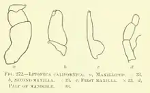 Inside the gill chamber, E. californica feeds on the blood and tissue of the host fish. To ensure secure attachment to the host, the isopod uses seven pairs of sharply hooked legs and its specialized mouthpart.[8][9] Due to the loss of blood for the host fish, the parasitic behavior of E. californica is thought to influence the host growth process.[9] The presence of E. californica in host fish may subject them to lower levels of vitality when encountering a decrease in the seawater salinity. E. californica is believed to be relatively harmless for the host fish, as its activity usually is not fatal.[9]