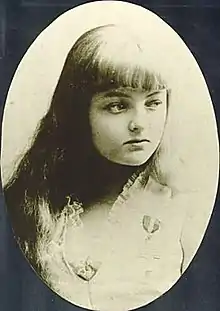 In the summer of 1879, the Madigan family tried to run their own small circus company in Finland and at the same time Hedvig began using the name Elvira Madigan.[6] The following year, when the family appeared in Circus Cremes in Vienna, Gisela Brož became a foster child in the family, she was two years older than Elvira. Gisela was trained as a tightrope dancer, and together with Elvira on slack line they practiced a unique number, where they appeared simultaneously on separate lines, one above the other. Elvira used to juggle at the same time as she was on the line. The number became a sensation, and in the following years the girls appeared as "daughters of the air" in circuses and in variety rooms across much of Europe, including in Berlin, Paris, London, Brussels and Moscow.[7] After an appearance at Tivoli in Copenhagen in 1886 before the Danish royal family, the girls were each awarded a gold cross by King Christian IX of Denmark.[8] The following year, John Madigan again started his own circus company, this time in Denmark. Gisela left the family in the autumn of the same year, after which Elvira had to appear alone when the tour continued to Sweden.