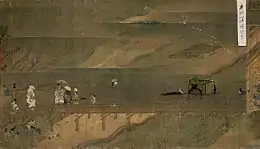 The Ippen biography, painted by a monk, remains remarkable for its influences, so far rare, from the Song dynasty (via the wash technique) and the Tang dynasty (the shan shui style), as well as by its very precise representations of forts in many Japanese landscapes.[63] As for the Saigyō Monogatari Emaki, it addresses the declining aristocracy in idealising the figure of the monk aesthete Saigyō by the beauty of its landscapes and its calligraphic poetry.[64]
