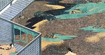 First, the Chōjū-jinbutsu-giga forms a monochrome sketch in ink gently caricaturing the customs of Buddhist monks, where the spontaneity of touch stands out.[40] Secondly, the Ban Dainagon Ekotoba tells of a political conspiracy in the year 866 by offering a surprising mixture of the two genres onna-e and otoko-e, with free lines and sometimes light, sometimes rich and opaque colors; this meeting of genres foreshadows the style that dominated a few decades later, during the Kamakura period.[41]