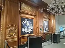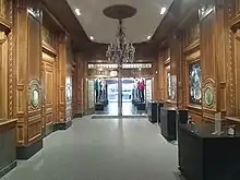 The woodwork of the inner lobby was intended to give an intimate feeling.[11] The space originally contained a ticket booth,[9] and the renovated inner lobby contains a counter near the north wall.[12] The walls contain blond-wood paneling with square mirrors;[12][13] while these mirrors still exist, they are covered with vinyl stickers.[12] Above the square mirrors are entablatures with friezes made of burled walnut, as well as gold-colored bas-relief panels with putti and vases. The square mirrors are separated by projecting, wood-paneled piers on each wall. The piers contain circular mirrors surrounded by carved wreaths. The coved ceiling is surrounded by a plasterwork frieze. The center of the ceiling has a gilded medallion, from which hangs a brass-and-crystal chandelier.[13]