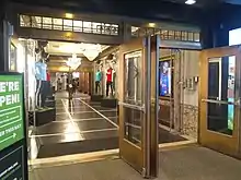 The theater's entrance vestibule has been modified several times since it opened.[6] There are two lobbies: an outer lobby with marble trim and an inner lobby with woodwork.[4][7] The outer lobby measures 40 feet (12 m) long and connects the theater's entrance vestibule and inner lobby. The inner lobby leads further inward into what was originally the auditorium. The lobby spaces are similar in design details.[8]