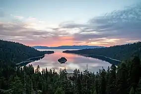 Emerald Bay State Park is a state park of California in the United States, centered on Lake Tahoe's Emerald Bay, a National Natural Landmark.[1] Park features include Eagle Falls and Vikingsholm, a 38-room mansion that is considered one of the finest examples of Scandinavian architecture in the United States.[2] The architect was Leonard Palme, who was hired by his aunt Laura Knight to design and build Vikingsholm. The park contains the only island in Lake Tahoe, Fannette Island. The park is accessible by California State Route 89 near the southwest shore of the lake. Emerald Bay is one of Lake Tahoe's most photographed and popular locations.