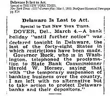 Beginning on February 14, 1933, Michigan, an industrial state that had been hit particularly hard by the Great Depression in the United States, declared a four-day bank holiday. Fears of other bank closures spread from state to state as people rushed to withdraw their deposits while they still could do so. Within weeks, all other states held their own bank holidays in an attempt to stem the bank runs, with Delaware becoming the 48th and last state to close its banks March 4.[1]