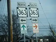Pennsylvania has a system of "color detour signs" in which any detour follows signs with a specific color.[26][27][28] The detours are meant to be used if a limited-access highway has to be closed for an emergency situation such as a flood or car accident, directing motorists along local roads near the limited-access highway to the next exit. According to a document produced by the Delaware Valley Regional Planning Commission containing information from the Pennsylvania Department of Transportation, they are generally color-coded according to direction, with blue meaning north, red meaning south, green meaning east, and orange meaning west, with other colors sometimes being used when detour routes overlap with one another.[27][29] However, the Pennsylvania Department of Transportation's own sign manual recommends that only black, blue, or orange be used.[30]